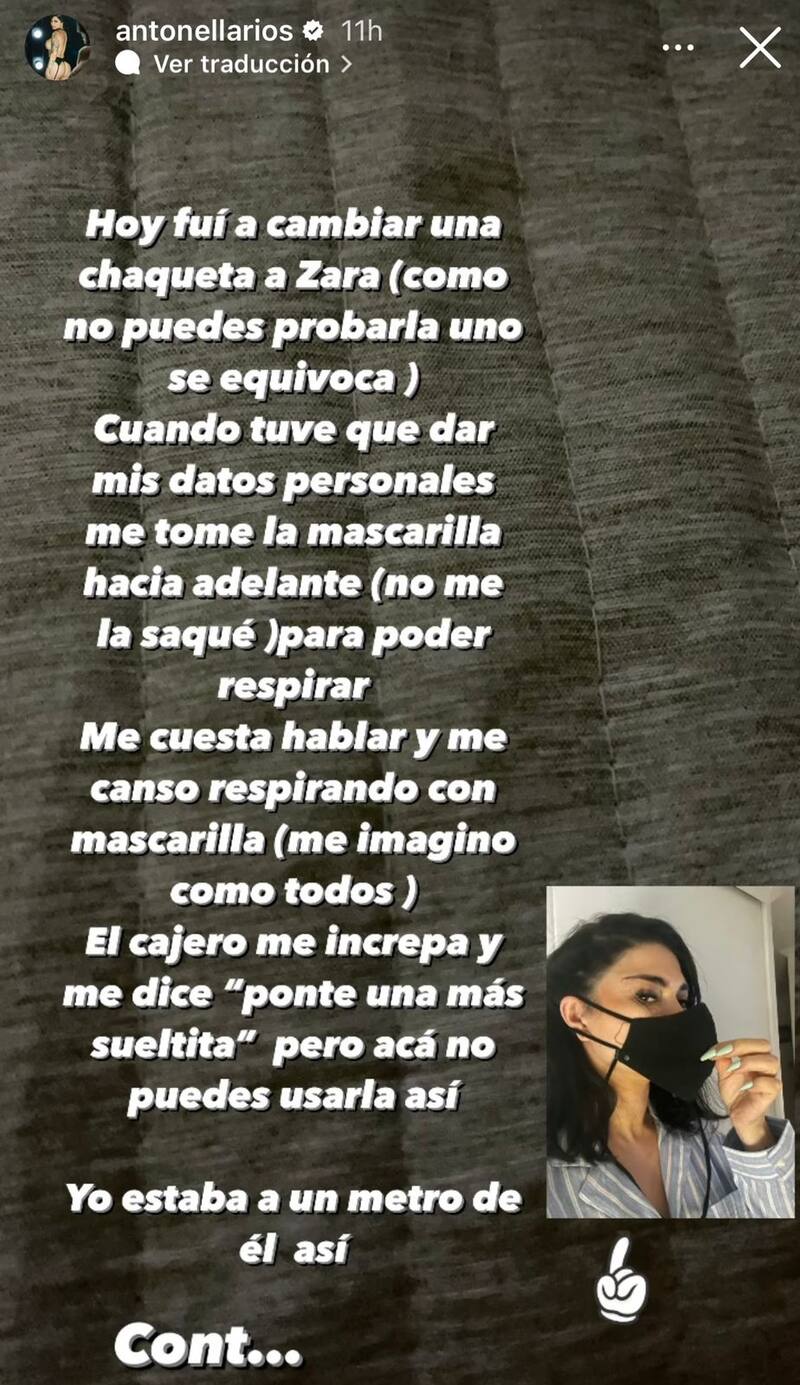 “Hoy fui a cambiar una chaqueta a Zara (como no puedes probarte uno se equivoca). Cuando tuve que dar mis datos personales, me tomé la mascarilla hacia adelante (no me la saqué) para poder respirar. Me cuesta hablar y me canso respirando con mascarilla (me imagino como todos)”, reveló de entrada la actriz.