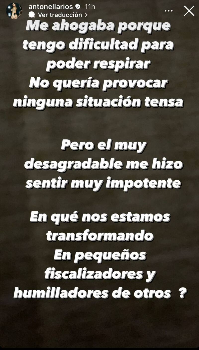 Sin embargo, Antonella fue más allá y contó más detalles de lo sucedido. “Me ahogaba porque tengo dificultad para poder respirar. No quería provocar ninguna situación tensa. El muy desagradable me hizo sentir impotente”, se desahogó.