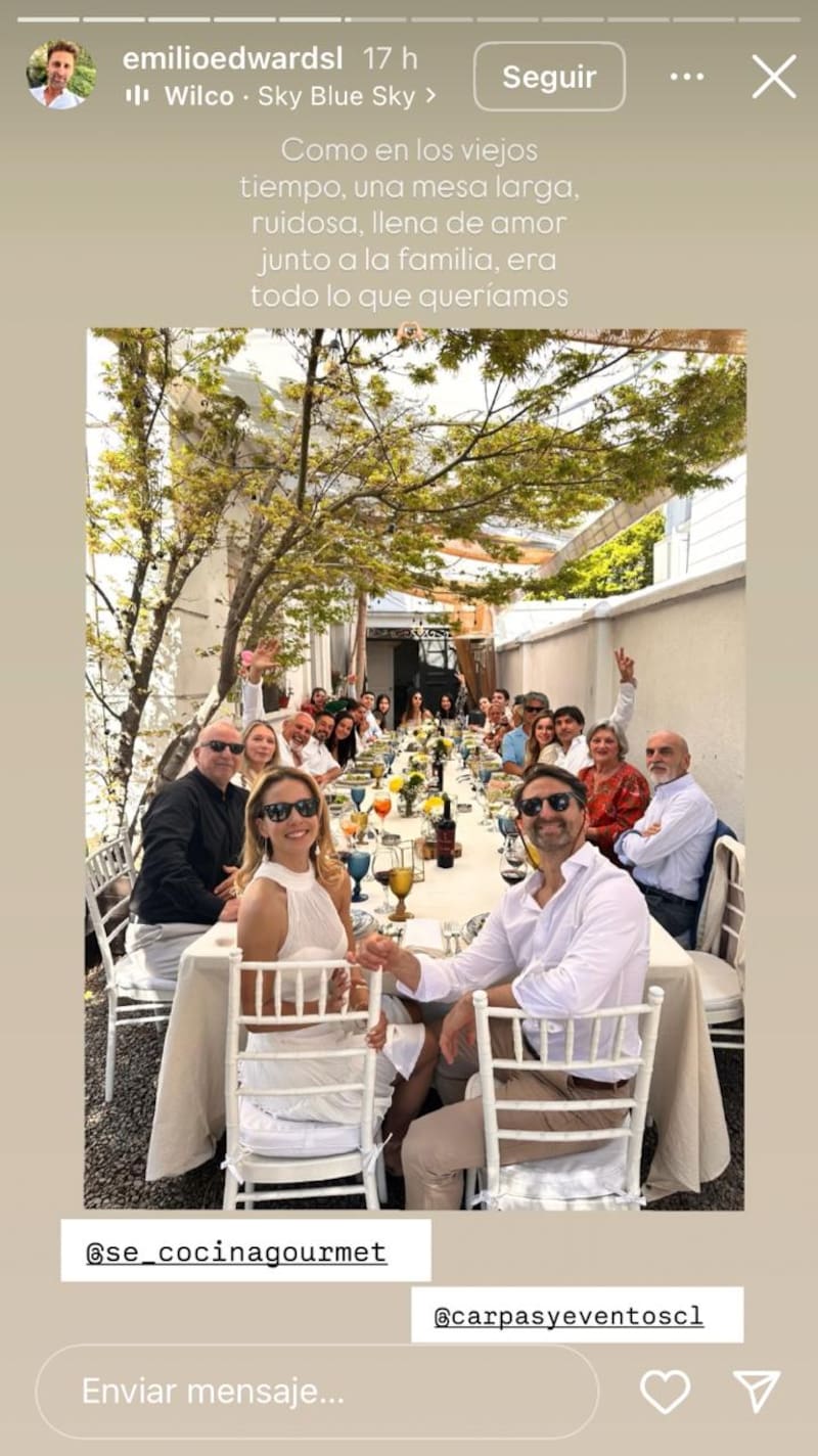 En sus historias, el actor publicó una postal en la que aparecen los novios disfrutando de una comida con sus invitados. “Como en los viejos tiempos, una mesa larga, ruidosa, llena de amor junto a la familia, era todo lo que queríamos”, escribió Edwards.