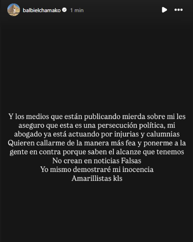 Tras su salida, Balbi publicó sentidos mensajes en su cuenta de Instagram. Acusó “persecución política” y aseguró que demostrará su inocencia.