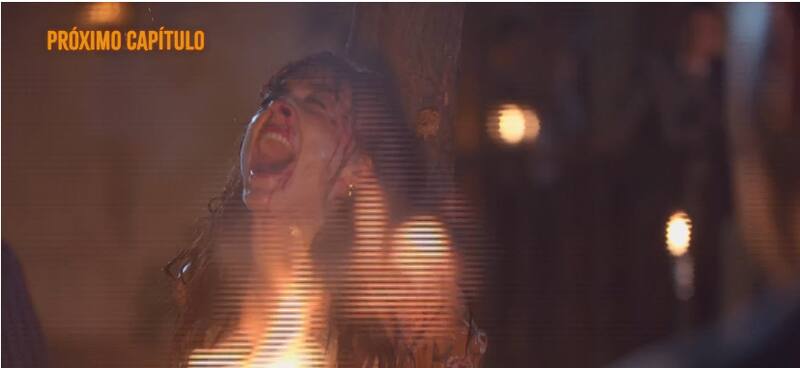 En la escena se puede ver a Herminia pidiendo ayuda mientras está amarrada en una hoguera.