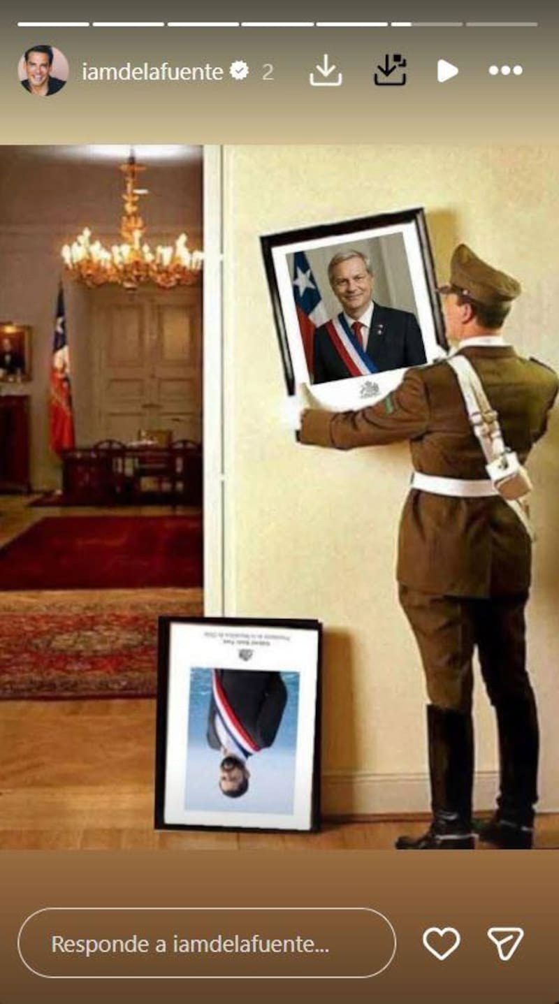 Cristián de la Fuente, quien en reiteradas ocasiones ha demostrado su rechazo al actual gobierno, compartió una imagen donde se aprecia a un carabinero instalando un cuadro de Kast como mandatario, mientras dejaba la imagen del Presidente Gabriel Boric en el suelo y dada vuelta.