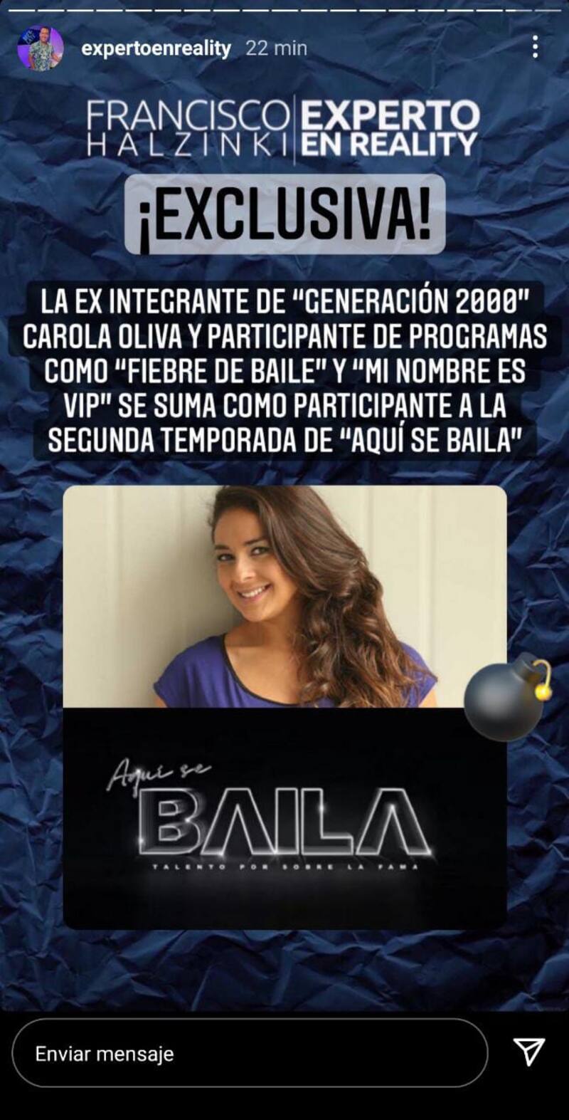 “La ex integrante de ‘Generación 2000′ Carola Oliva y participante de programas como ‘Fiebre de Baile’ o “Mi Nombre es Vip’ se suma como participante de la segunda temporada de ‘Aquí se Baila’”, afirmó vinculando otro conocido rostro al show.