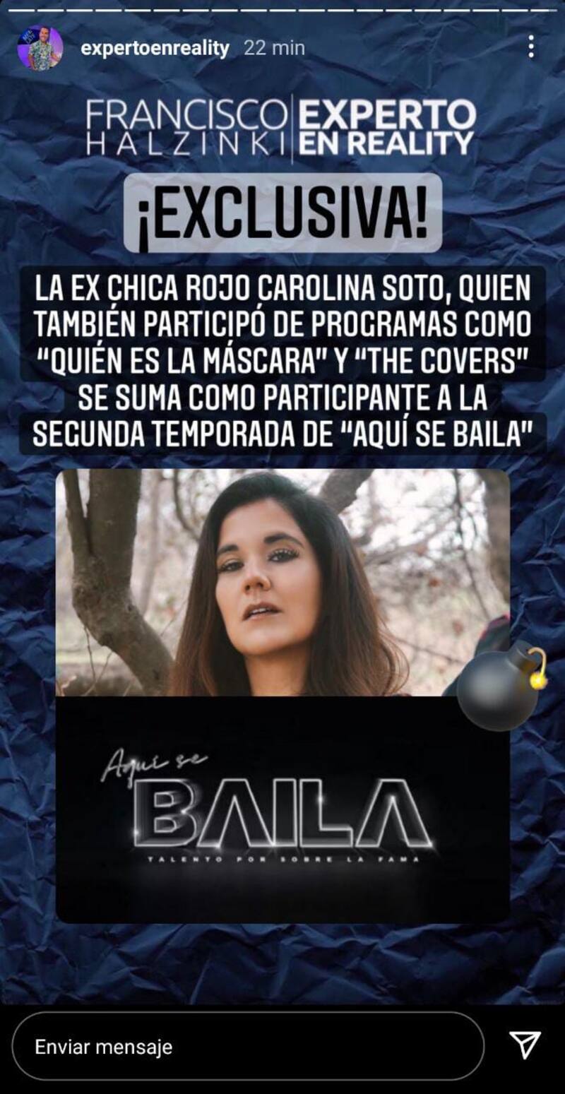 “La ex chica Rojo, Carolina Soto quien también participó de programas como ‘Quién es La Máscara’ y ‘The Covers’ se suma como participante a la segunda temporada de ‘Aquí se Baila’”, añadió sorprendiendo con la información.