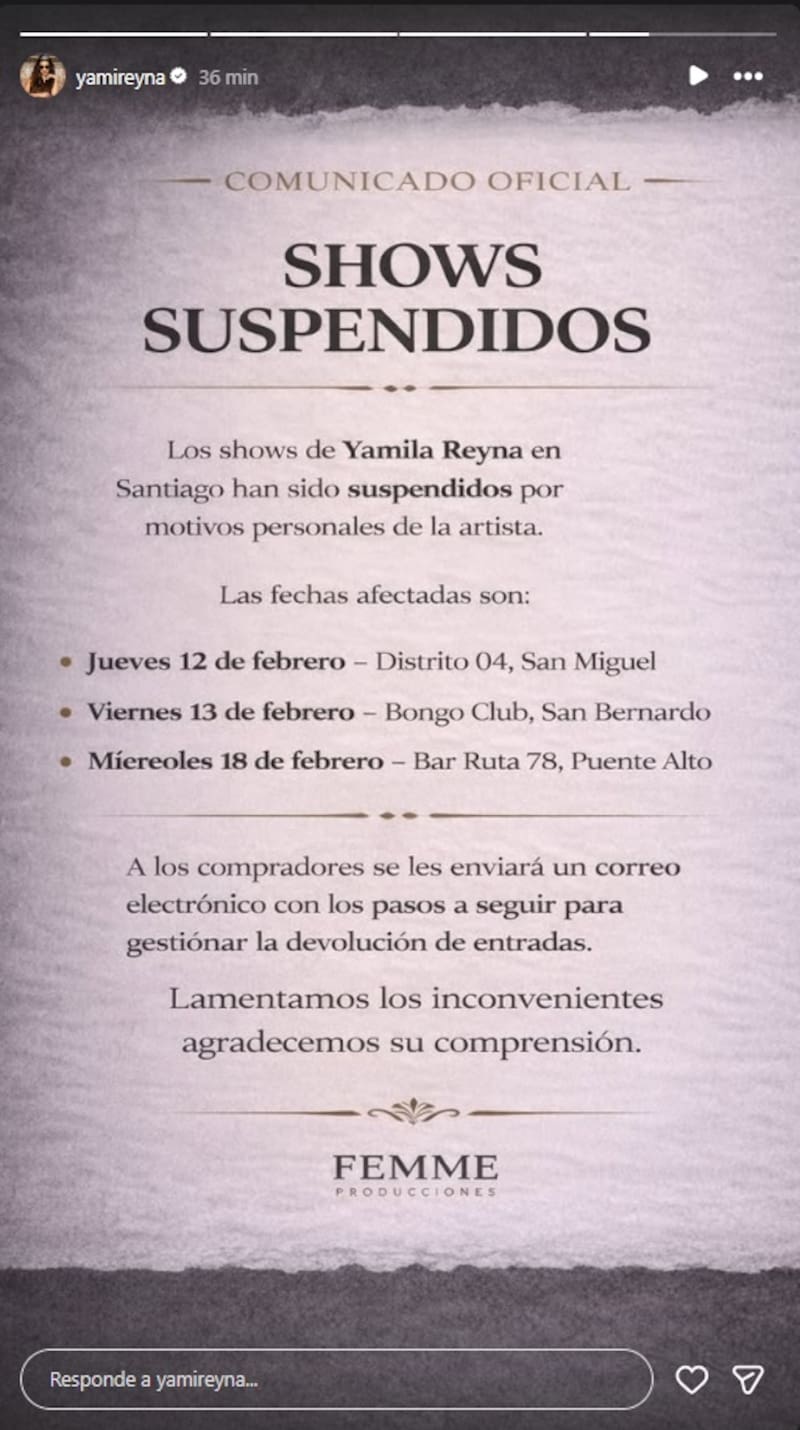 “Los shows de Yamila Reyna en Santiago han sido suspendidos por motivos personales de la artista", informaron.