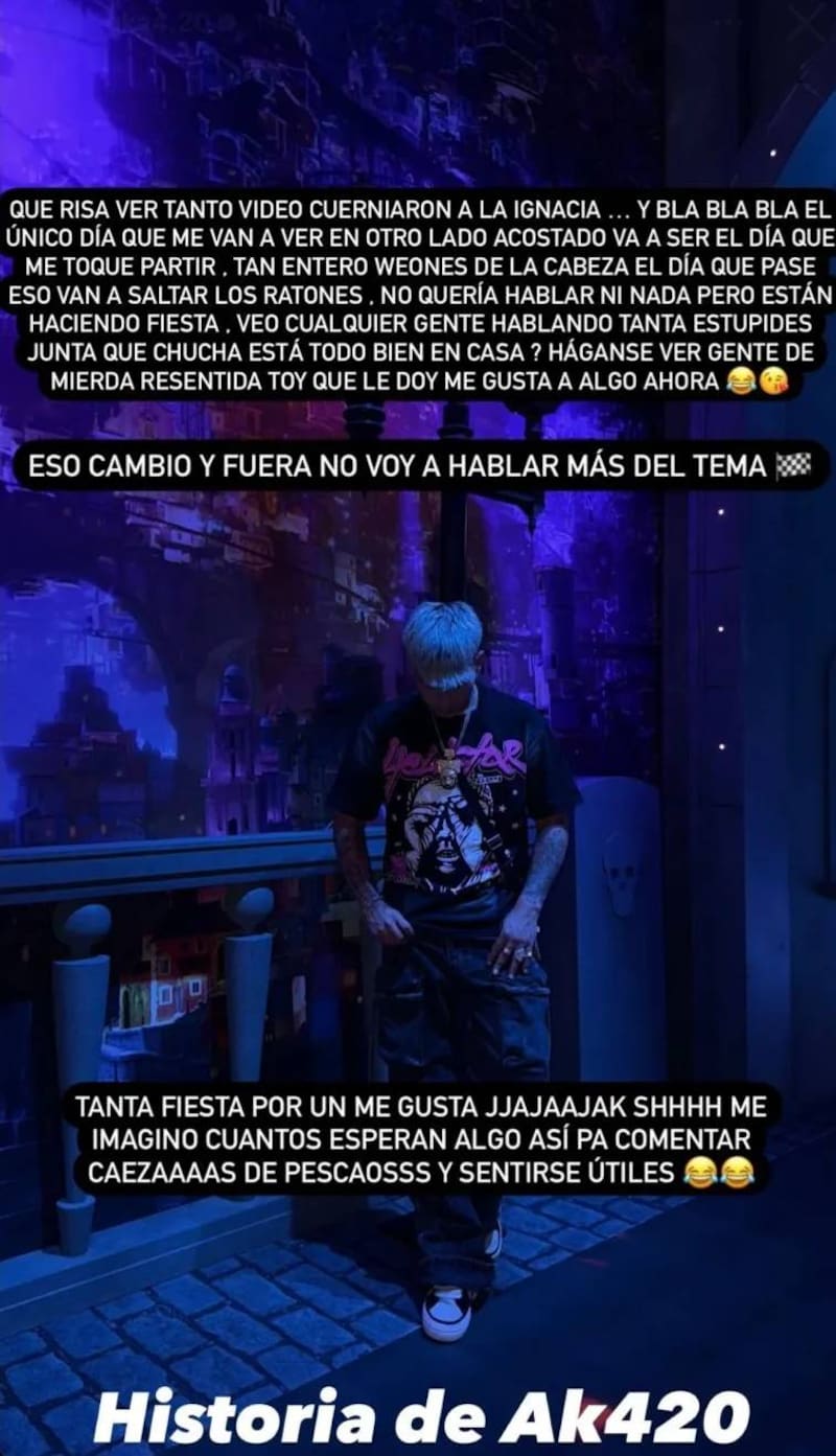 “¿Está todo bien en casa? Háganse ver, gente de mierda resentida. Estoy que le doy me gusta a algo ahora. Eso, cambio y fuera, no voy a hablar más del tema”, complementó evidentemente molesto.