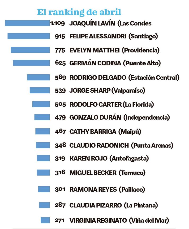 Otro hecho que no pasó piola fue que en los primeros lugares se ubicaron los alcaldes afines al Gobierno. Y para el cientista político de la U. Diego Portales, Patricio Navia, se debe a que "de partida son de comunas importantes. Quizás en Contulmo hay una muy buena gestión, pero es Contulmo, por lo que no van a aparecer en la tele".