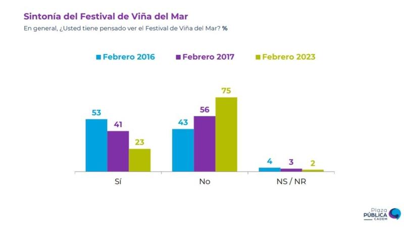 Ante la pregunta ¿usted tiene pensado ver el Festival de Viña del Mar?, según datos preliminares de Cadem, solo un 23% asegura que tiene pensado verlo.