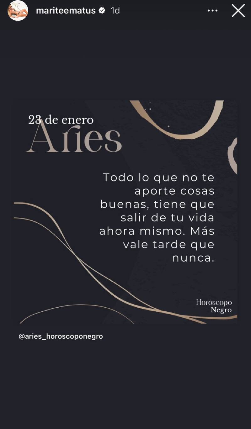 “Todo lo que no te aporte cosas buenas, tiene que salir de tu vida ahora mismo. Más vale tarde que nunca”, se puede leer en una imagen que Matus subió a la mencionada plataforma virtual.