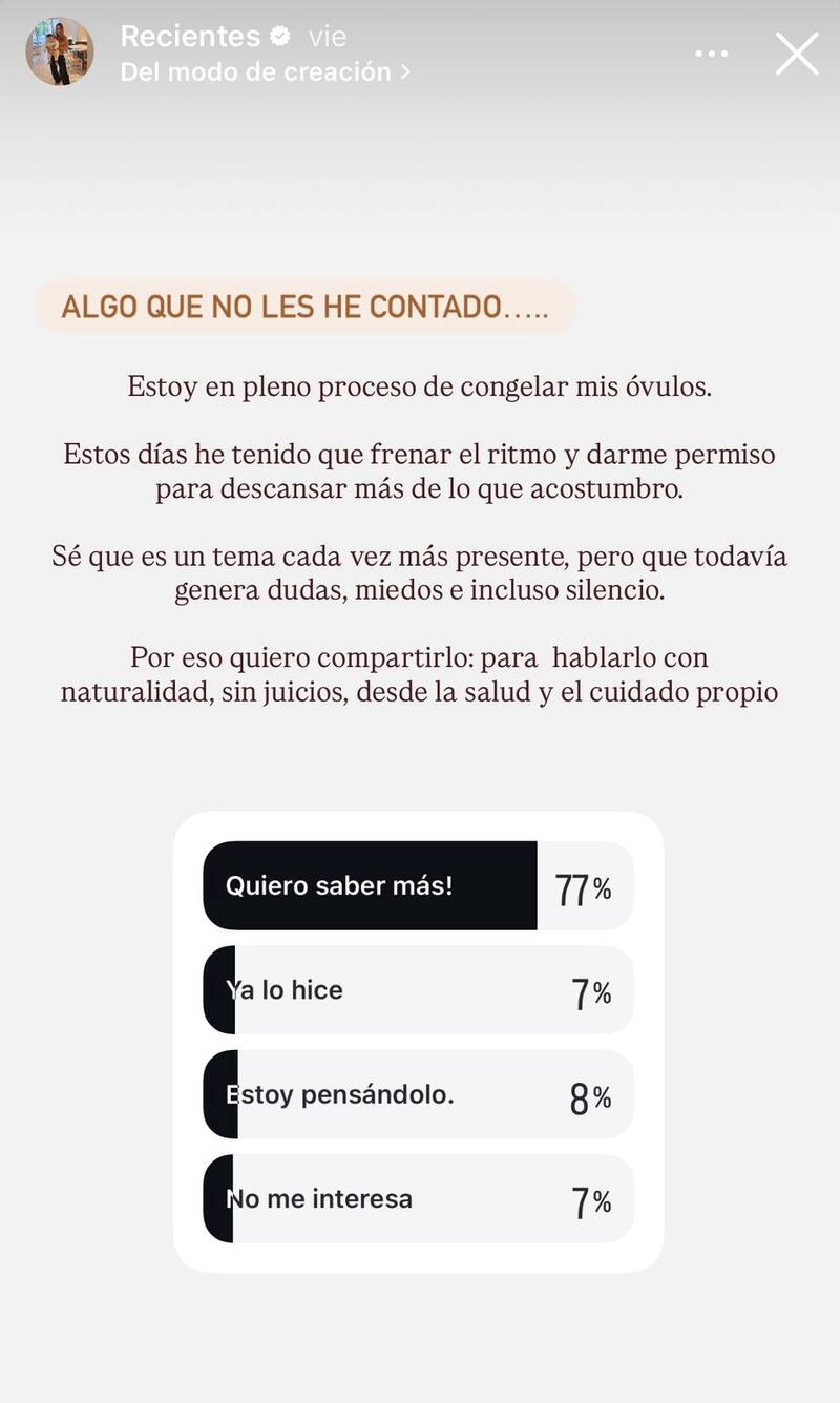 “Algo que no les he contado… Estoy en pleno proceso de congelar mis óvulos”, escribió la influencer, en modo revelación, en la mencionada plataforma virtual.