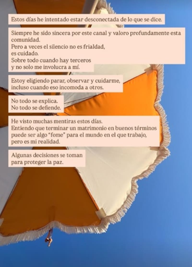 “Pero a veces el silencio no es frialdad, es cuidado. Sobre todo cuando hay terceros y no solo me involucra a mí. Estoy eligiendo parar, observar y cuidarme, incluso cuando eso incomoda a otros”, complementó.