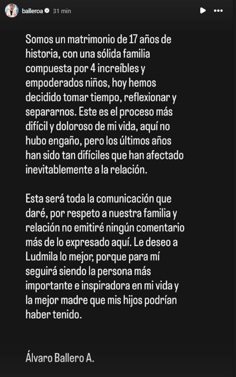 En su comunicado, Ballero habló a grandes rasgos del motivo de su ruptura matrimonial. Descartó infidelidad.