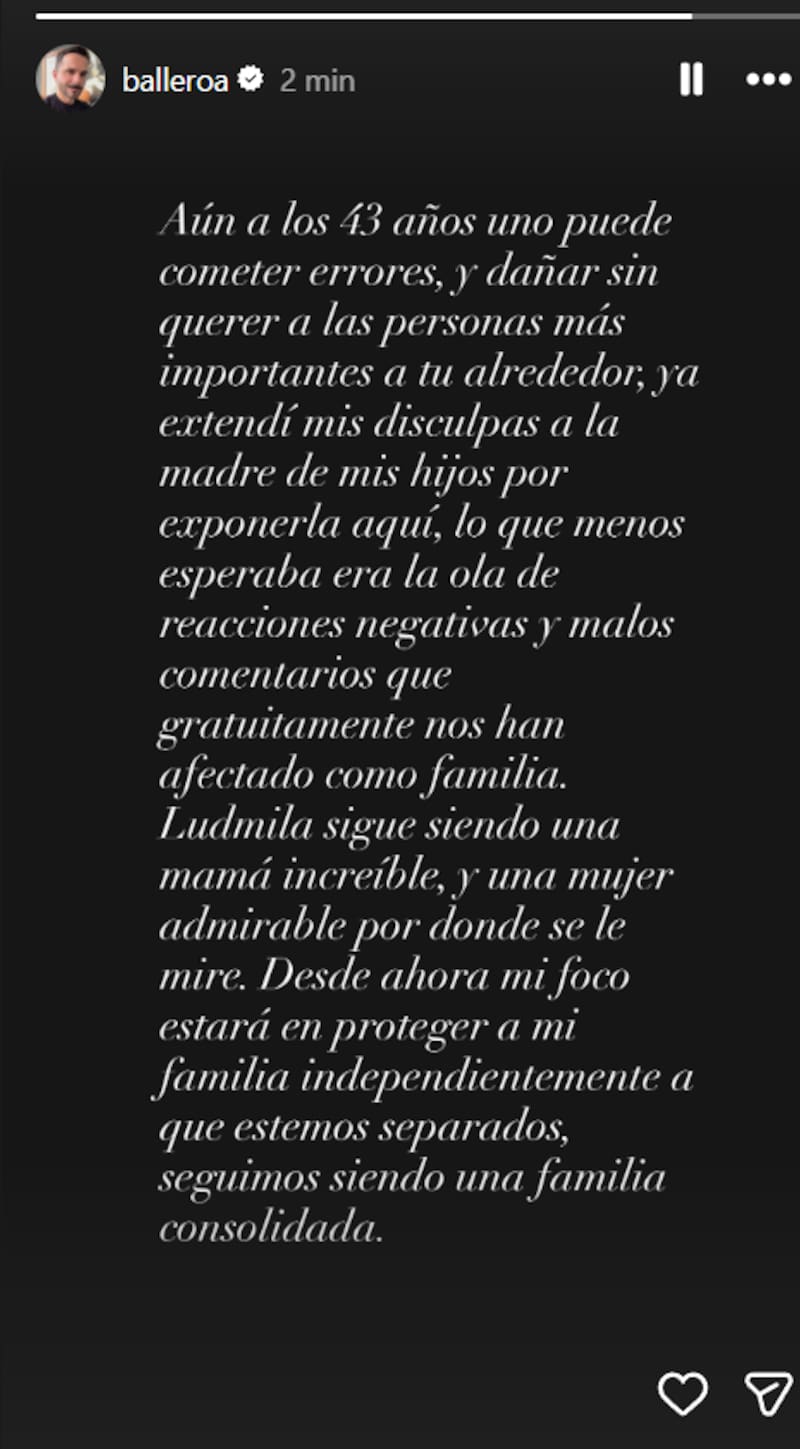 Tras ello, Ballero publicó en redes sociales, sentidas disculpas para su exmujer.
