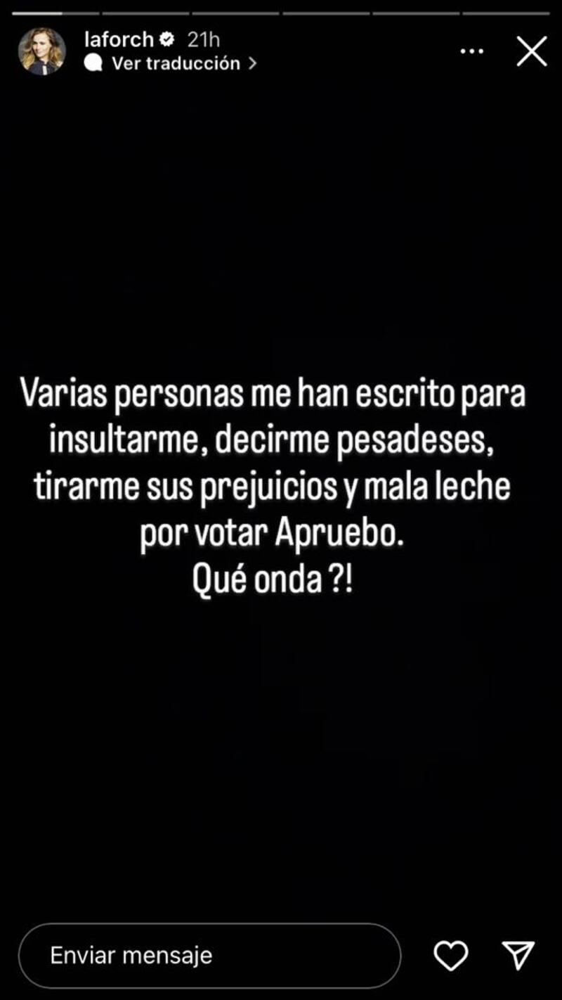 Sin embargo, tras compartir su opinión y manifestarse a favor de la Nueva Constitución, Amaya Forch denunció a través de sus historias de Instagram que ha recibido varios insultos.