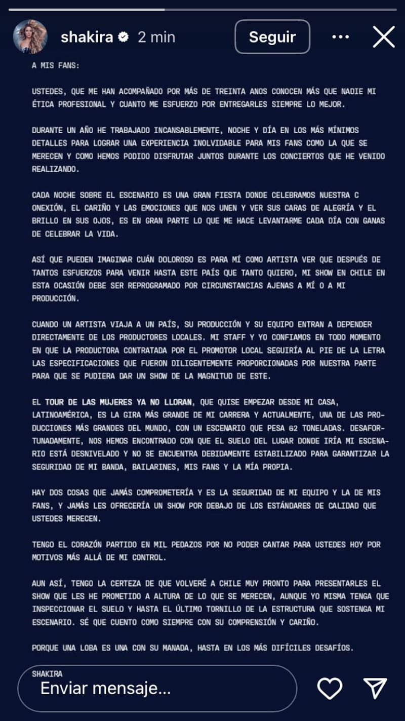 Por Bastián Escalona Ampuero¡Ambos shows suspendidos!: conciertos de Shakira en el Estado Nacional serán reprogramados
