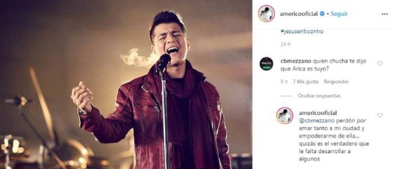 Y si bien recibió cientos de mensajes positivos por parte de sus fanáticos, algunos usuarios arremetieron nuevamente en su contra. "¿Quién chu... te dijo que Arica es tuyo?", le escribió @cbmezzano, generando la rápida respuesta del artista.