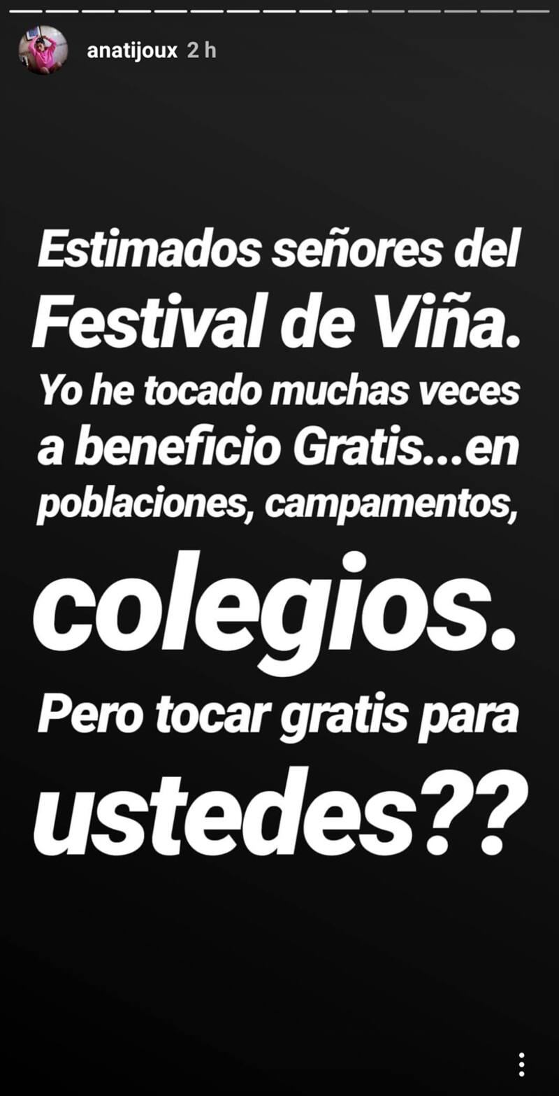 "Estimados señores del Festival de Viña. Yo he tocado muchas veces a beneficio, gratis…. en poblaciones, campamentos, colegios. Pero ¿tocar gratis para ustedes?", escribió Tijoux en sus historias de Instagram.