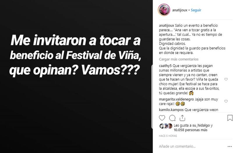 "Me invitaron a tocar a beneficio del Festival de Viña, qué opinan? Vamos???", escribió la artista a través de su Instagram, denunciando el denigrante incidente que vivió.