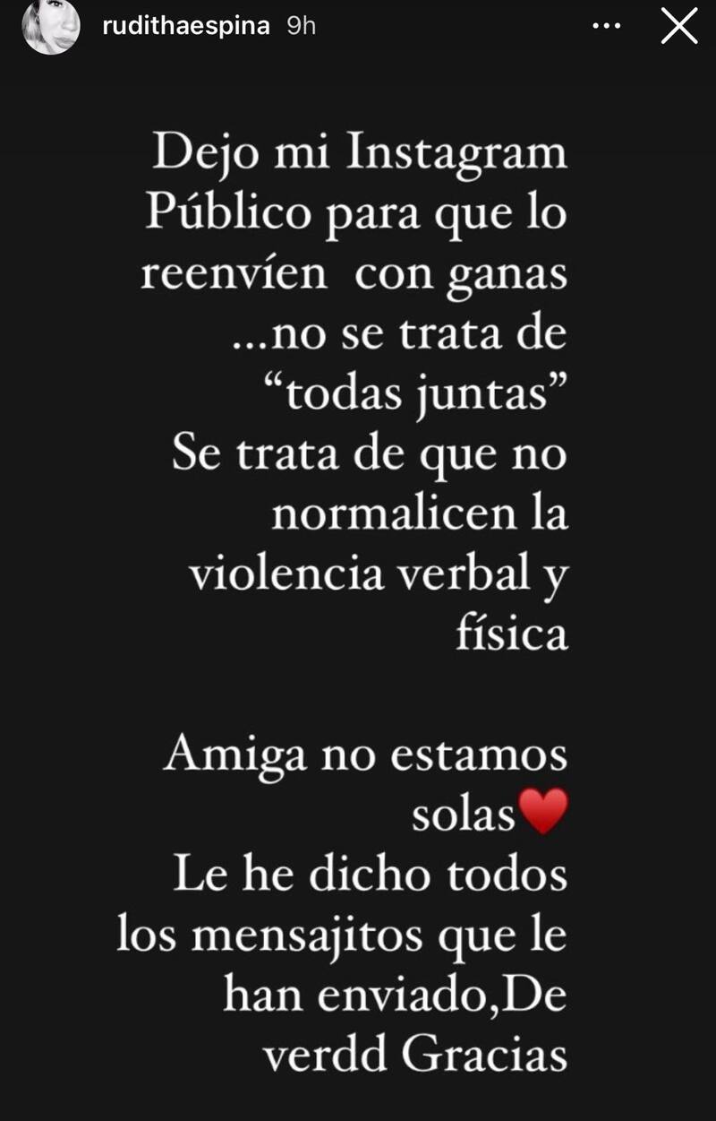 “Es TOTALMENTE necesario cerrarle la boca a un ‘papá’ que no es CAPAZ de asumir la violencia que su hijo cometió y más aún, que él propio DESMIENTE que le pegó a quien fue su Señora. Entonces demostremos con imágenes, las cuales están escritas en el parte de constatación de lesiones”, escribió en sus historias la mujer, en alusión la defensa que realizó Adán Pineda, padre de Jean Paul, en el matinal de Canal 13.
