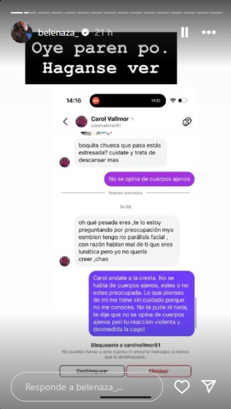 Ante un mensaje que recibió, la comediante aseguró que “no se opina de cuerpos ajenos”, lo que desató una fuerte respuesta de la usuaria. Belenaza no lo dejó pasar y le contestó con todo.
