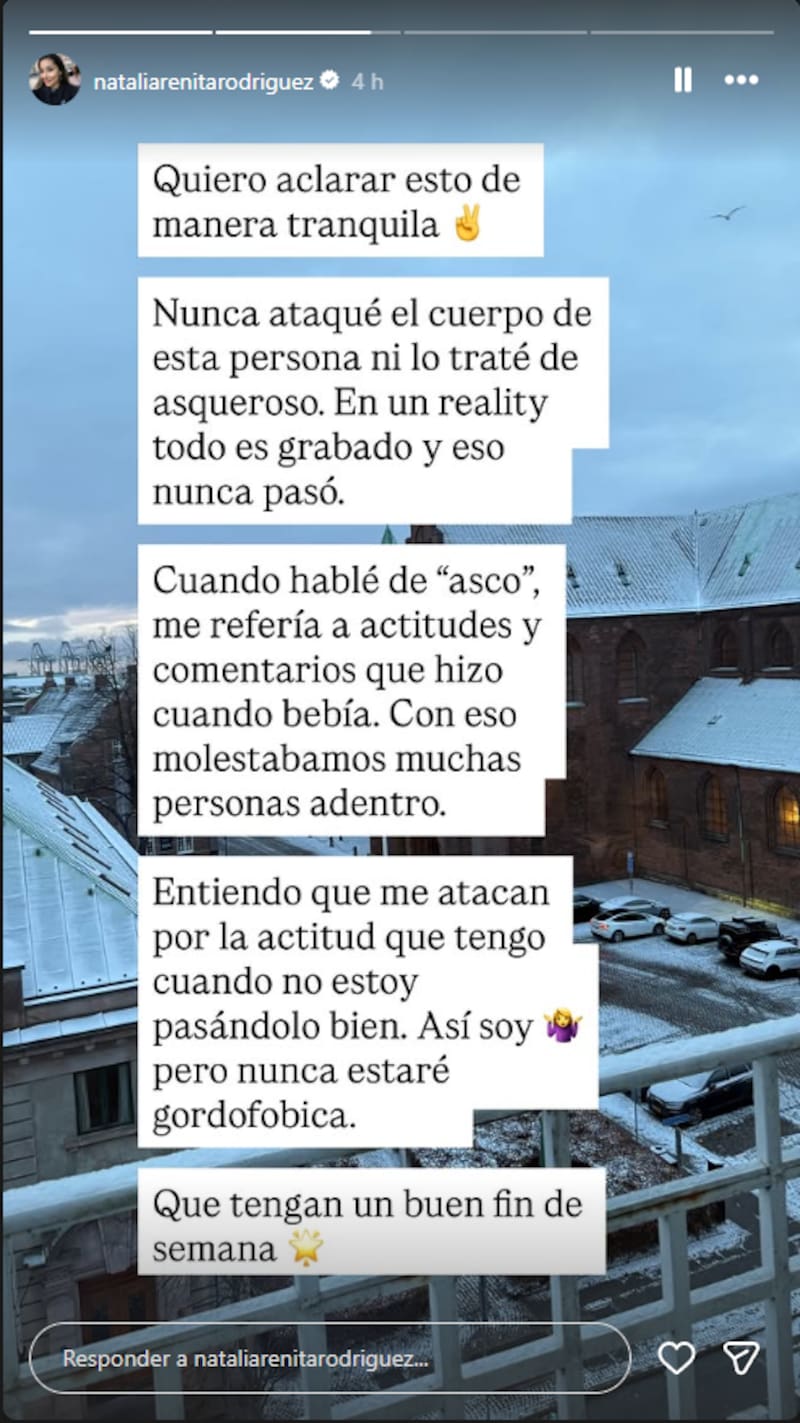 “Quiero aclarar esto de manera tranquila”, comenzó. “Nunca ataqué el cuerpo de otra persona ni lo traté de asqueroso. En un reality todo es grabado y eso nunca pasó”, sentenció.