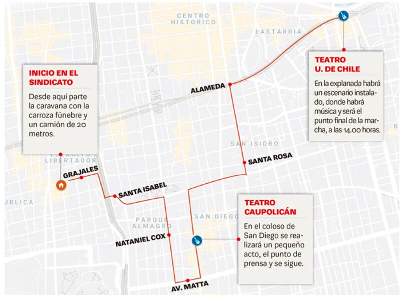 "Saldremos desde nuestro sindicato Sinamuarchi, en Carrera con Grajales, luego nos juntaremos con unos dirigentes en el Teatro Caupolicán y terminaremos todo en el teatro de la Universidad de Chile con un concierto. Pensamos que todo terminará a las 14 horas", dateó Leo Soto, dirigente gremial de los músicos y maestro de la cumbia de la Sonora Tommy Rey.