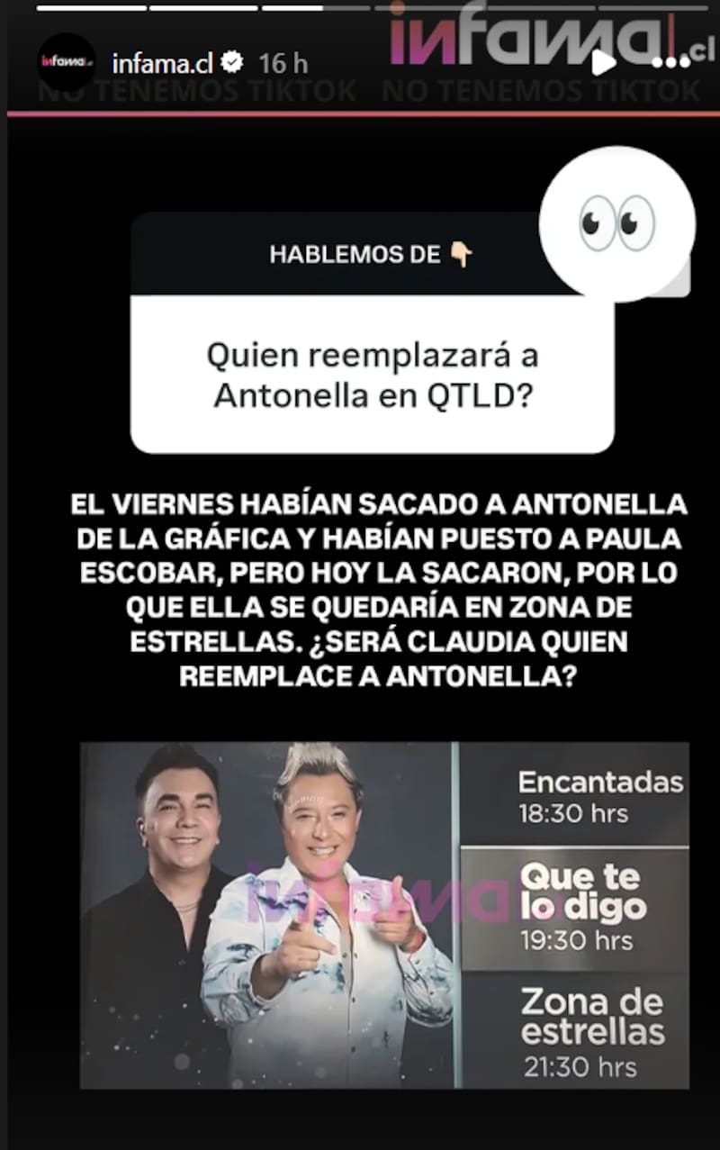“El viernes habían sacado a Antonella de la gráfica y habían puesto a Paula Escobar, pero hoy la sacaron, por lo que ella se quedaría en Zona de Estrellas”, planteó la cuenta de Instagram.