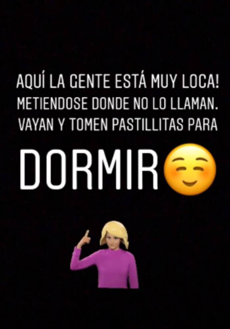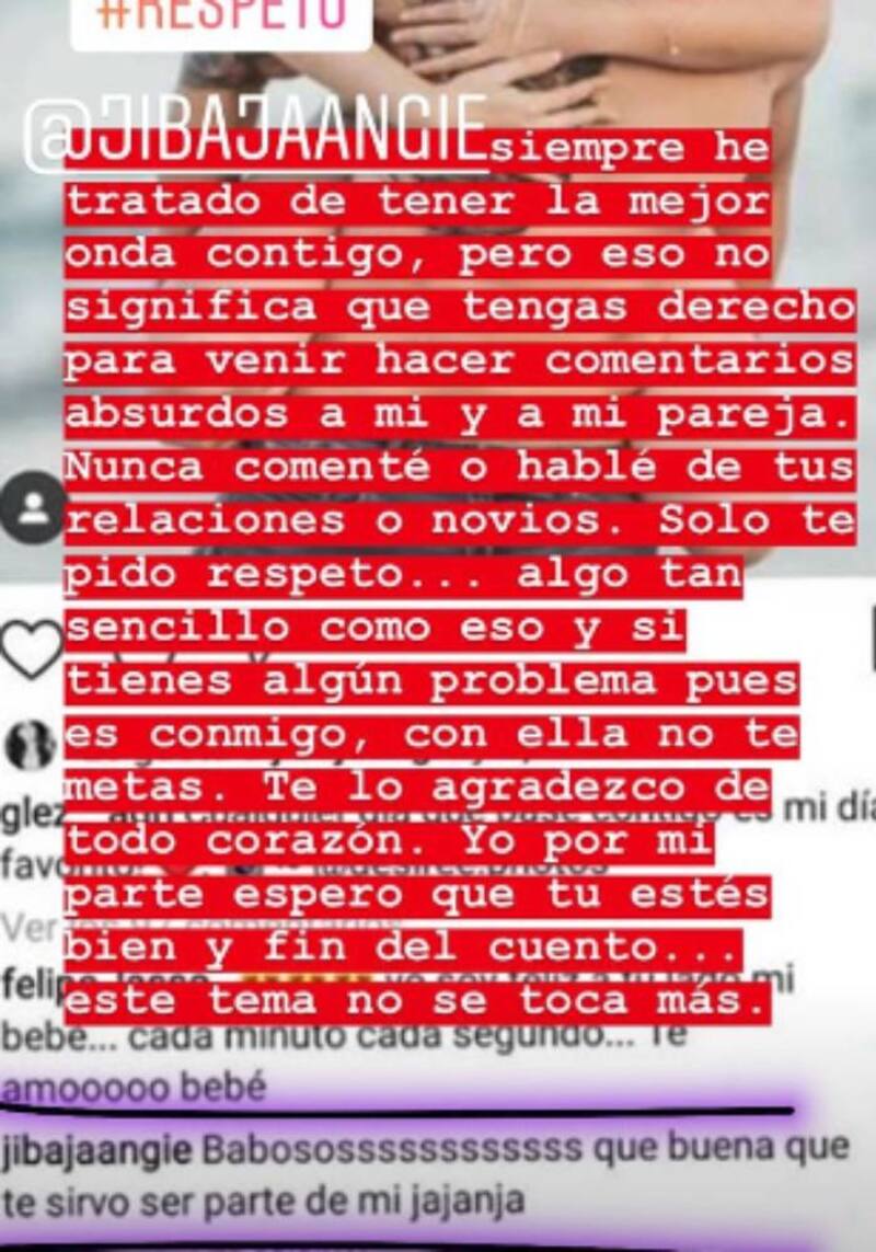 "Siempre he tratado de tener la mejor onda contigo, pero eso no significa que tengas el derecho para venir a hacer comentarios absurdos de mí y mi pareja. Nunca comenté o hablé de tus relaciones o novios. Solo te pido respecto. Algo tan sencillo como eso. Y si tienes algún problema es conmigo, con ella no te metas. Te lo agradezco de todo corazón. Yo por mi parte espero que tu estés bien y fin del cuento. Este tema no se toca más", se defendió.