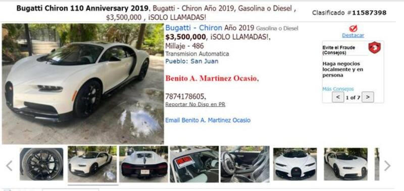 La presunta oferta del Bugatti Chiron 110 del año 2019 a 3,5 millones de dólares aparece en clasificadosonline.com, un portal de Puerto Rico donde los ciudadanos publican fotos de residencias y vehículos para vender o alquilar.