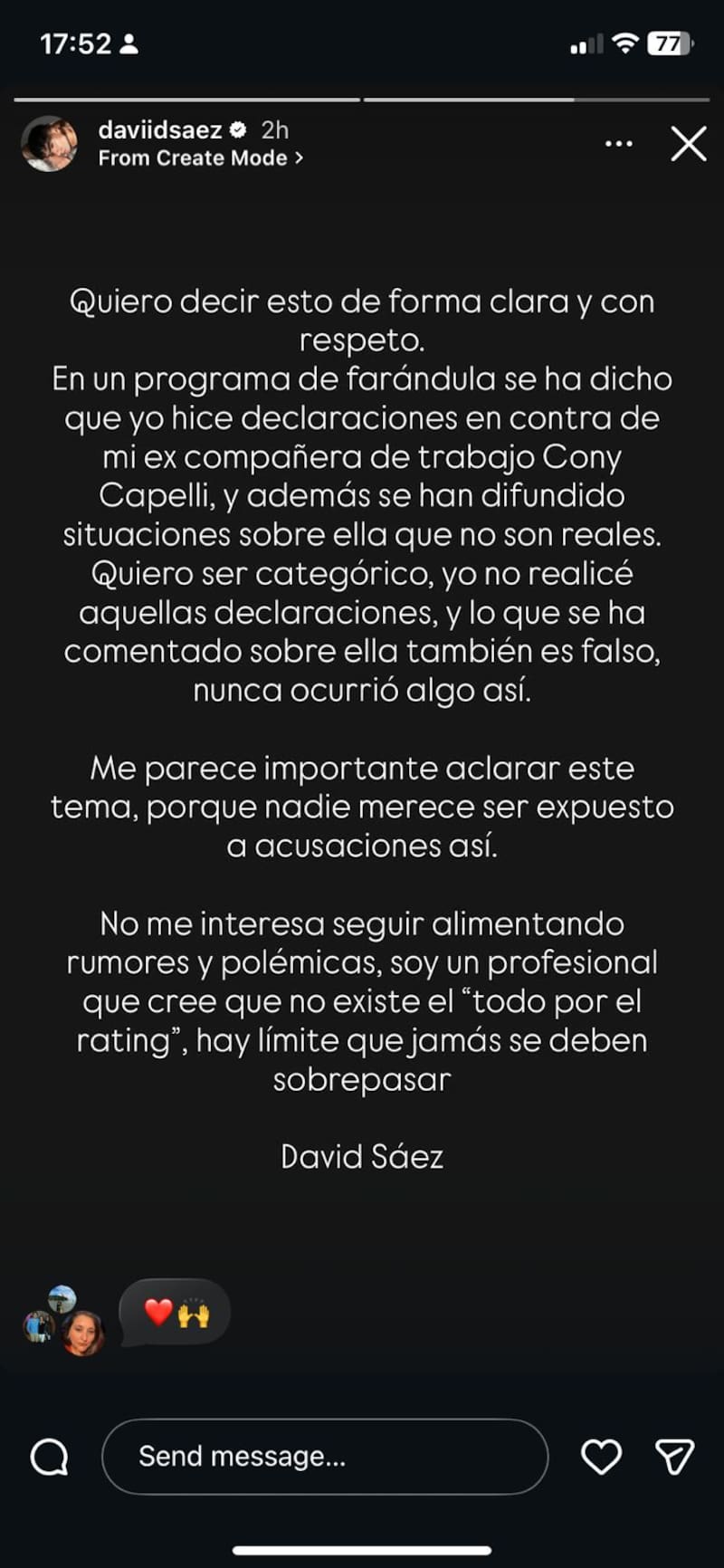 La tarde del domingo, Sáez alzó la voz para desmentir al periodista. “Quiero decir esto de forma clara y con respeto. En un programa de farándula se ha dicho que yo hice declaraciones en contra de mi excompañera de trabajo Cony Capelli, y además se han difundido situaciones sobre ella que no son reales”, comenzó.