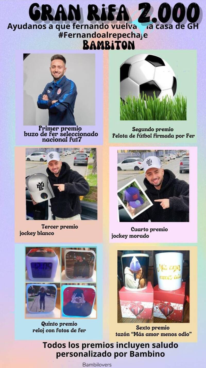 Además ofrece jockeys que pertenecen a Bambino, para el cuarto premio está destinado un reloj con fotografías del joven deportista y finalmente una taza con el mensaje “más amor, menos odio” y una foto de Fernando con Alessia.