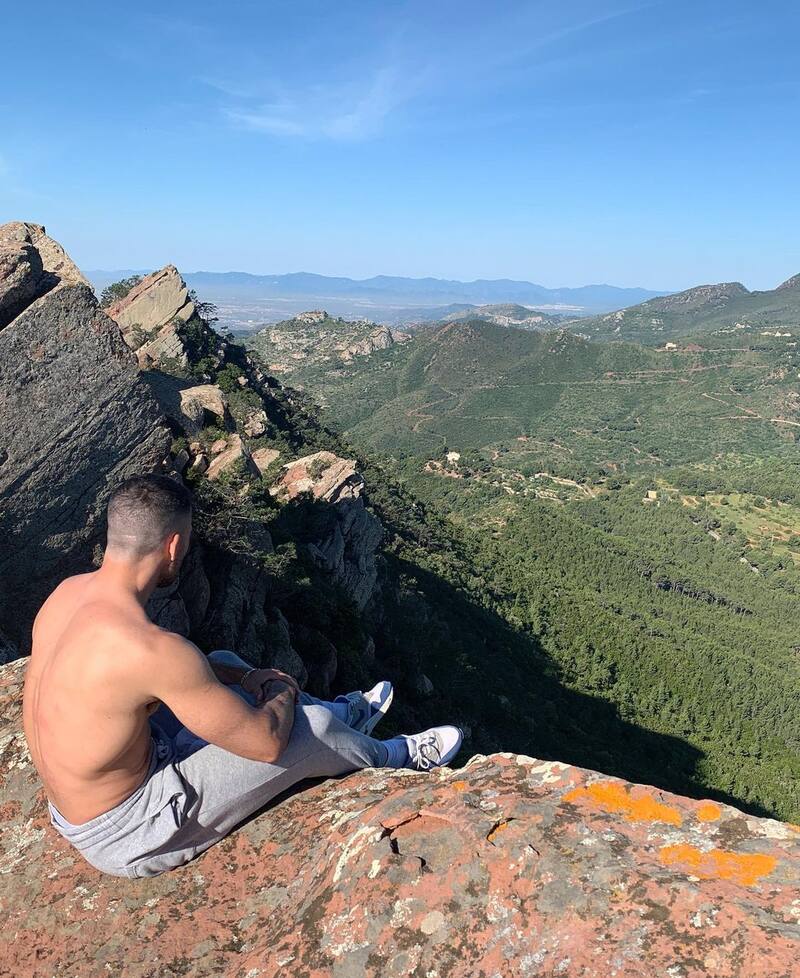 El artista hizo trekking en una altísima colina en Benicasim, España; y desde la cima se fotografió solo con la parte inferior de un buzo y sin polera, desatando los suspiros de su fanaticada.