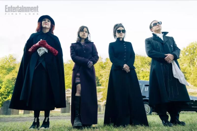 Mientras que la segunda imagen muestra a los personajes Delia y Lydia Deetz, Astrid Deetz -hija de Lydia e interpretada por Jenna Ortega- y Rory, interpretado por Theroux y de quien aun no se tiene más información. Estos cuatro aparecen en lo que sería un funeral.