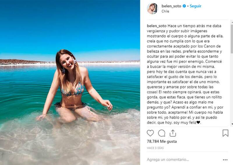 Sin embargo, Belén Soto dejó lo más contundente de su reflexión para el final, donde aseguró que por fin se aceptó tal cual es. "Aprendí a confiar en mi, y por sobre todo, aceptarme. Mi cuerpo no habla sobre mi, yo hablo por el, y así te puedo decir, que hoy, soy muy feliz", finalizó.