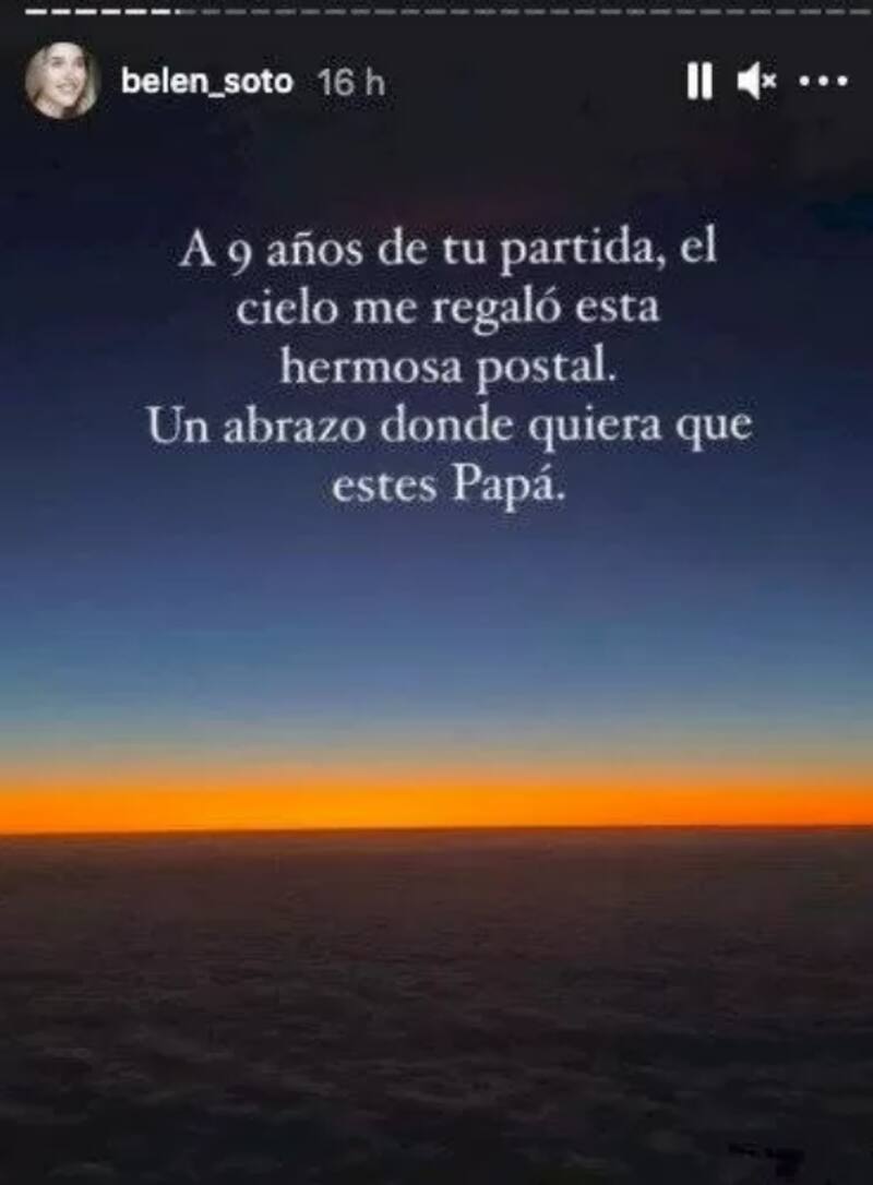 "A 9 años de tu partida, el cielo me regaló esta hermosa postal. Un abrazo donde quiera que estés, Papá", escribió la actriz. Además, subió la imagen de un atardecer tomada desde las alturas.