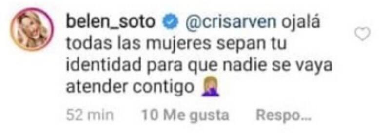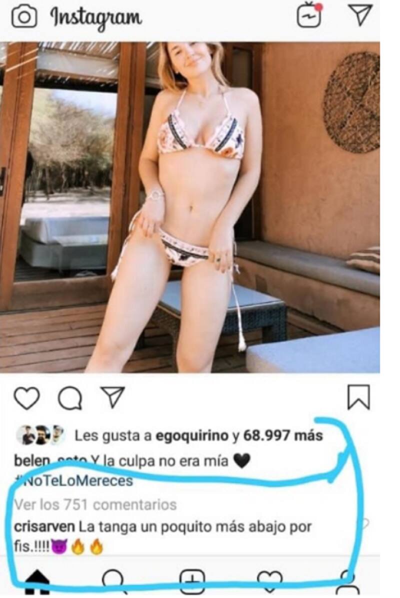 Esta semana, Belén Soto compartió una fotografía en Instagram donde aparece en bikini, la cual tituló con la frase de la canción "Un violador en tu camino": "Y la culpa no era mía", escribió en la biografía.