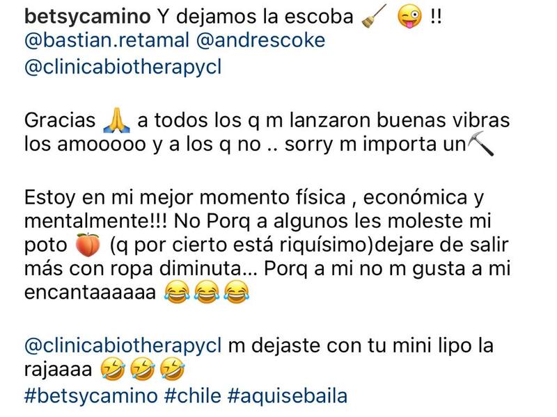 “Y dejamos la escoba. Gracias a todos los que me lanzaron buenas vibras los amooooo y a los que no...Sorry me importa un…”, expresó Betsy Camino a modo de inicio de su publicación del show al ritmo del tema “You Make Me Feel”.