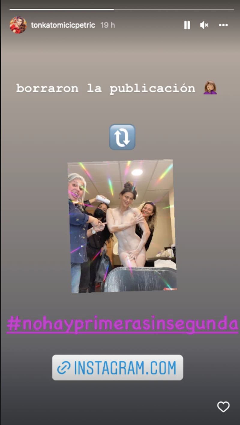 “Borraron la publicación”, escribió Tomicic en una historia en la que se ve la fotografía y un enlace de la publicación que se encuentra inactivo, para luego agregar el hashtag “no hay primera sin segunda”.