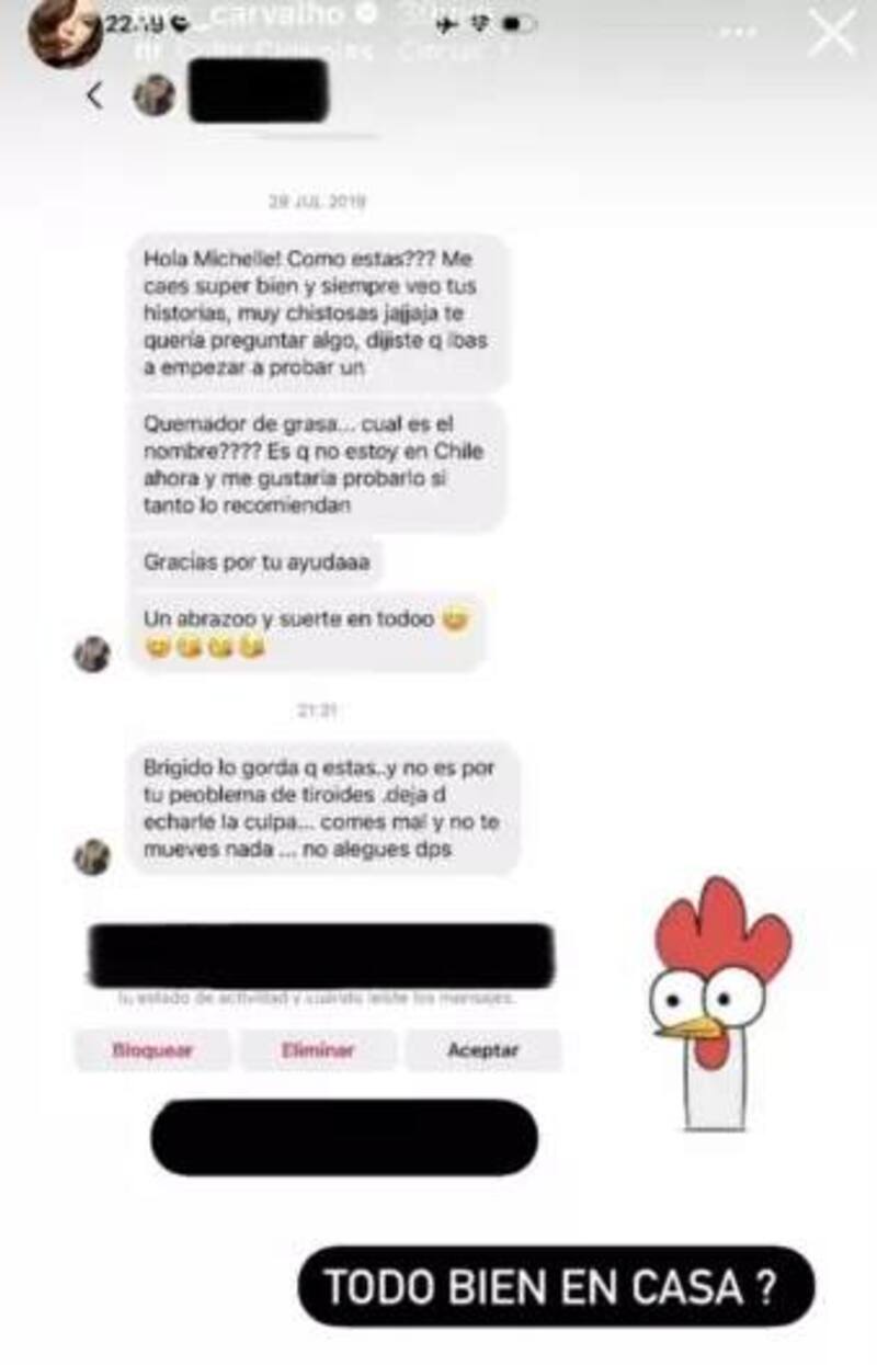 “Brígido lo gorda que estás y no es por tu problema de tiroides, deja de echarle la culpa. Comes mal y no te mueves nada… no alegues después”, se podía leer en le pantallazo que la misma Michelle compartió en sus stories.
