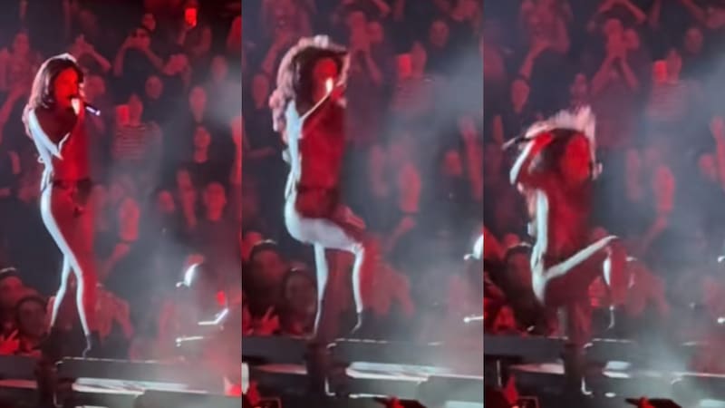 Sin darse cuenta, la artista llegó al borde del escenario, dio otro paso hacia atrás y cayó de espalda al piso, ante el asombro de los presentes.