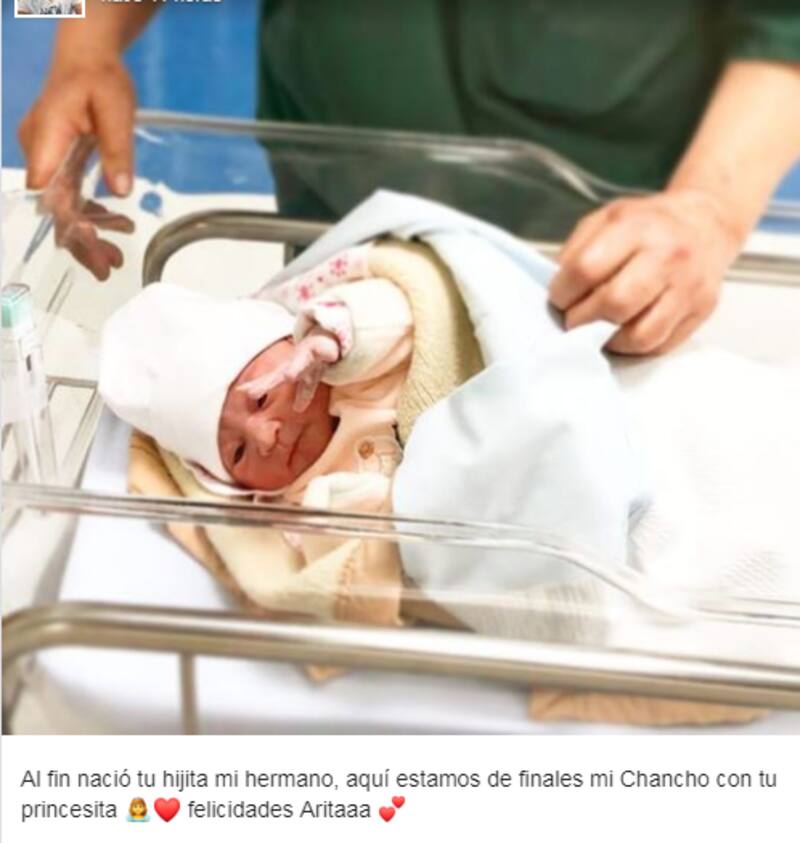 "Al fin nació tu hijita mi hermano, aquí estamos de finales mi Chancho con tu princesita. Felicidades Arita", publicó en Nicolás Facebook junto a una foto de la bebé.