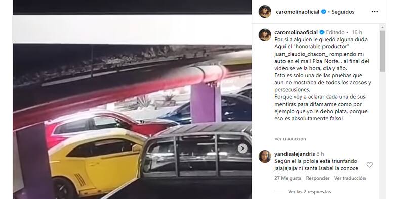 “Por si a alguien le quedó alguna duda. Aquí el “honorable productor” Juan Claudio Chacón rompiendo mi auto en el mall Plaza Norte. Al final del video se ve la hora, día y año. Esto es solo una de las pruebas que aún no mostraba de todos los acosos y persecuciones, porque voy a aclarar cada una de sus mentiras para difamarme, como por ejemplo que yo le debo plata, porque eso es absolutamente falso!”, señaló la cantante en su publicación.