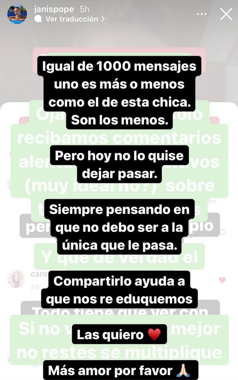 “Hoy no lo quise dejar pasar. Siempre pensando en que no debo ser la única que le sucede. De 1000 mensajes, uno es más o menos como el de esta chica. Son los menos. Compartirlo ayuda a que nos reeduquemos”, remató.