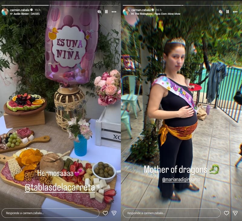 En sus historias de Instagram, la actriz publicó un video donde mostró una mesa con flores rosadas y un rico picoteo, como quesos, jamón y distintas frutas. Junto a esto, había un globo rosado con la frase: “Es una niña”.