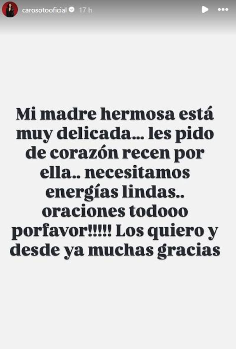 "Mi madre hermosa está muy delicada… Les pido de corazón que recen por ella“, escribió la artista en la mencionada plataforma virtual.