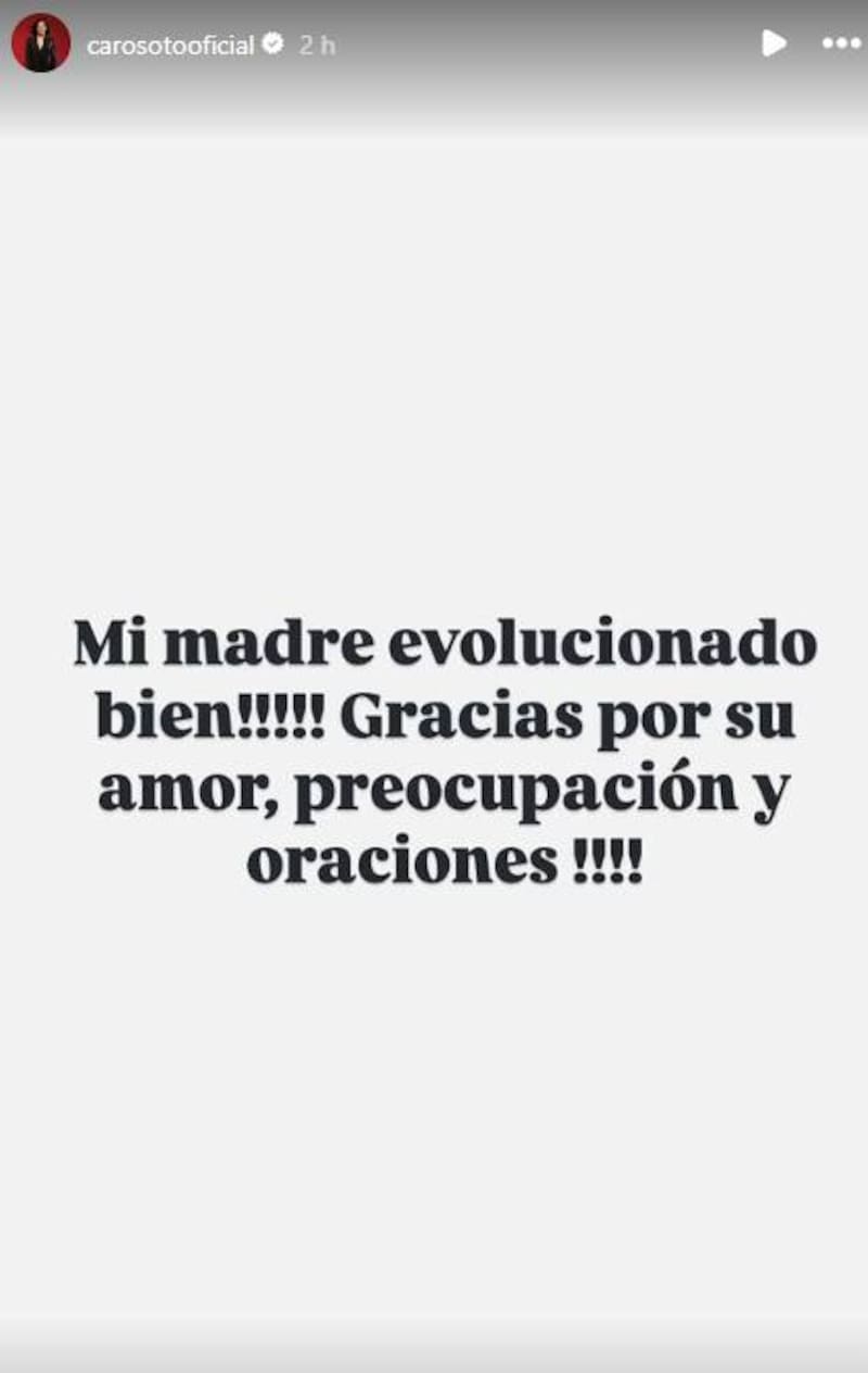 “Mi madre evolucionando bien!! Gracias por su amor, preocupación y oraciones”, indicó la reconocida intérprete nacional.