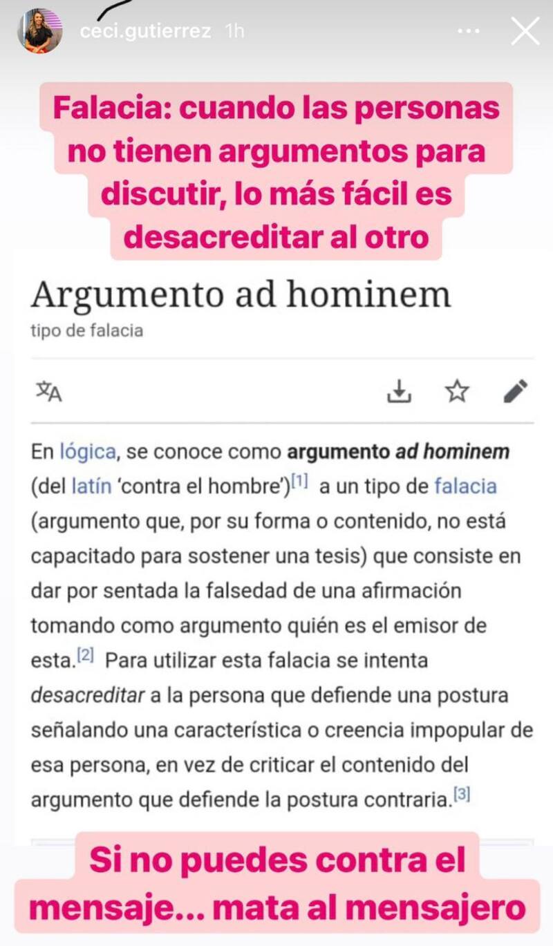 Sin embargo, el cahuín no quedó ahí. De hecho, esta mañana la Ceci reaccionó en la misma red social ante los dichos de su colega, aunque sin mencionarlo directamente.