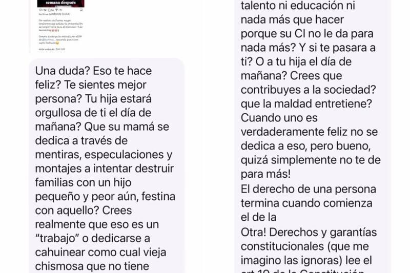 El mensaje parte así: “¿Eso te hace feliz? ¿Te sientes mejor persona? ¿Tu hija estará orgullosa de ti el día de mañana? Que su mamá se dedica a través de mentiras, especulaciones y montajes a intentar destruir familias con un hijo pequeño y peor, festina con aquello”.