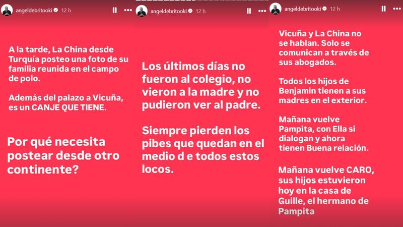 “Fue a la comisaría a denunciar el impedimento de contacto. Hay video de Benjamín en la puerta de la casa de la madre de los niños. En la comisaría le dijeron que debe iniciar una acción penal en su contra. Lo hará mañana, hoy fue feriado”, agregó.