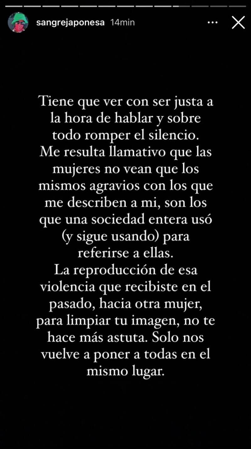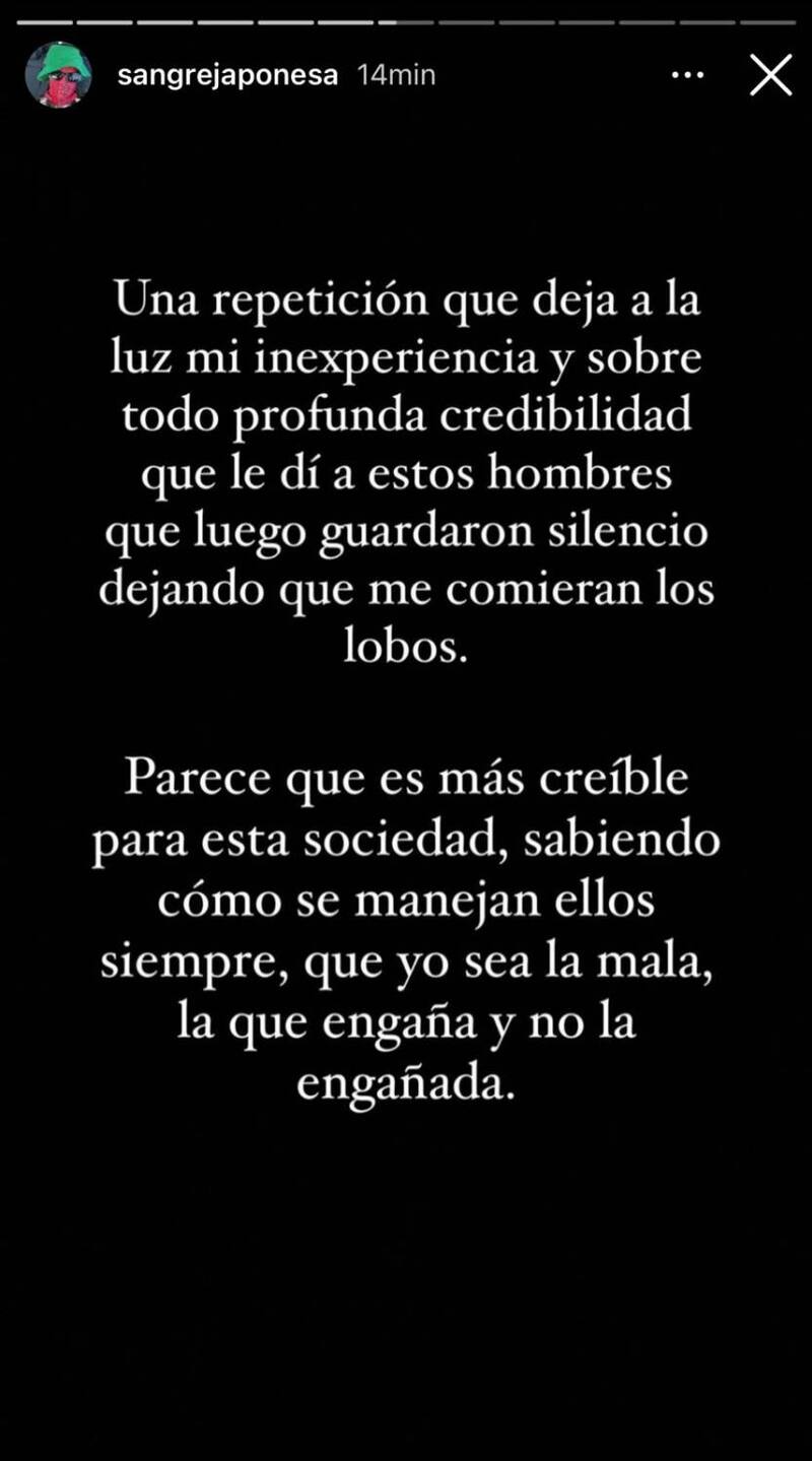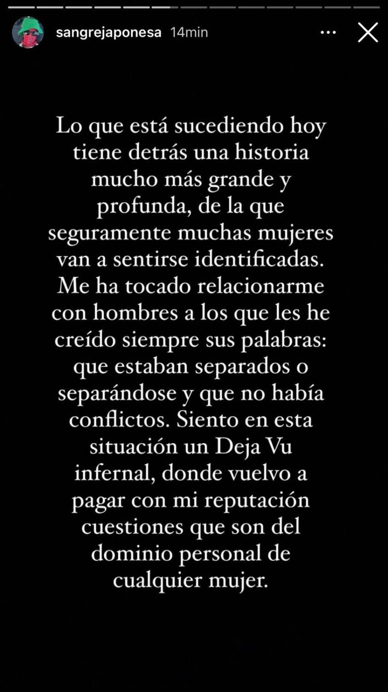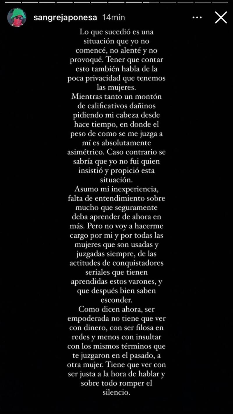 "Siento en esta situación un Deja Vu infernal, donde vuelvo a pagar con mi reputación cuestiones que son de dominio personal de cualquier mujer. Una repetición que deja a la luz mi inexperiencia y sobre todo profunda credibilidad que le di a estos hombres que luego guardaron silencio dejando que me comieran los lobos", dijo, haciendo referencia a Vicuña, con quien habría iniciado su romance cuando éste todavía era pareja de Pampita.